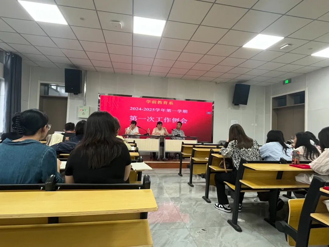 云天收夏色,秋的韵味悄然而至。朝气蓬勃、热情洋溢的身影驱散了假期的沉寂,唤醒了校园的活力,教育之梦再次起航。为进一步加强学前教育系日常工作建设,确保2024年秋季学期教学工作的有序开展,9月9日下午,学前教育系在10号楼5层阶梯教室召开了新学期全体教师第一次工作例会。由分管教学工作的李小红副主任主持,系部领导班子和全体教师参加会议。详细(……)