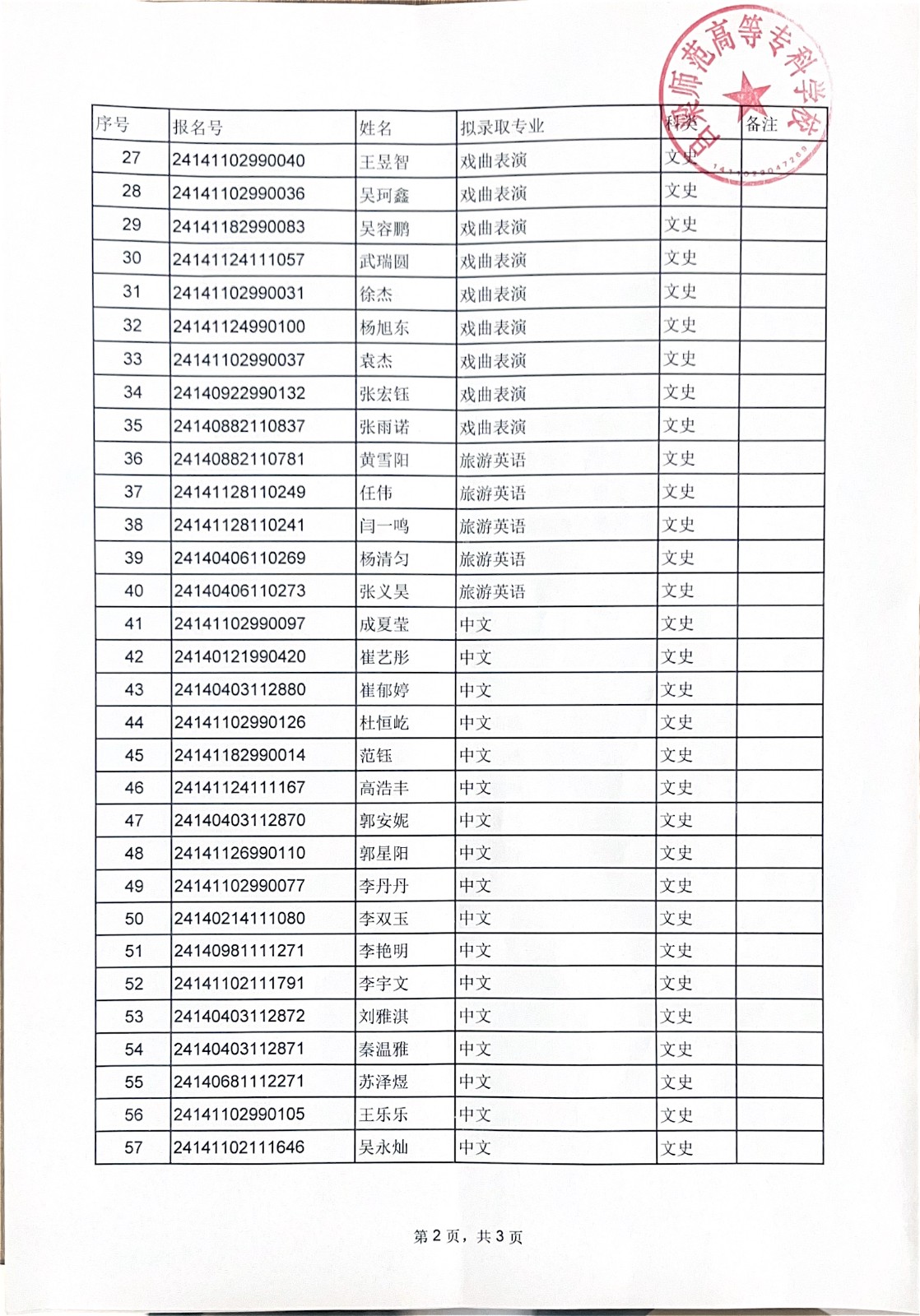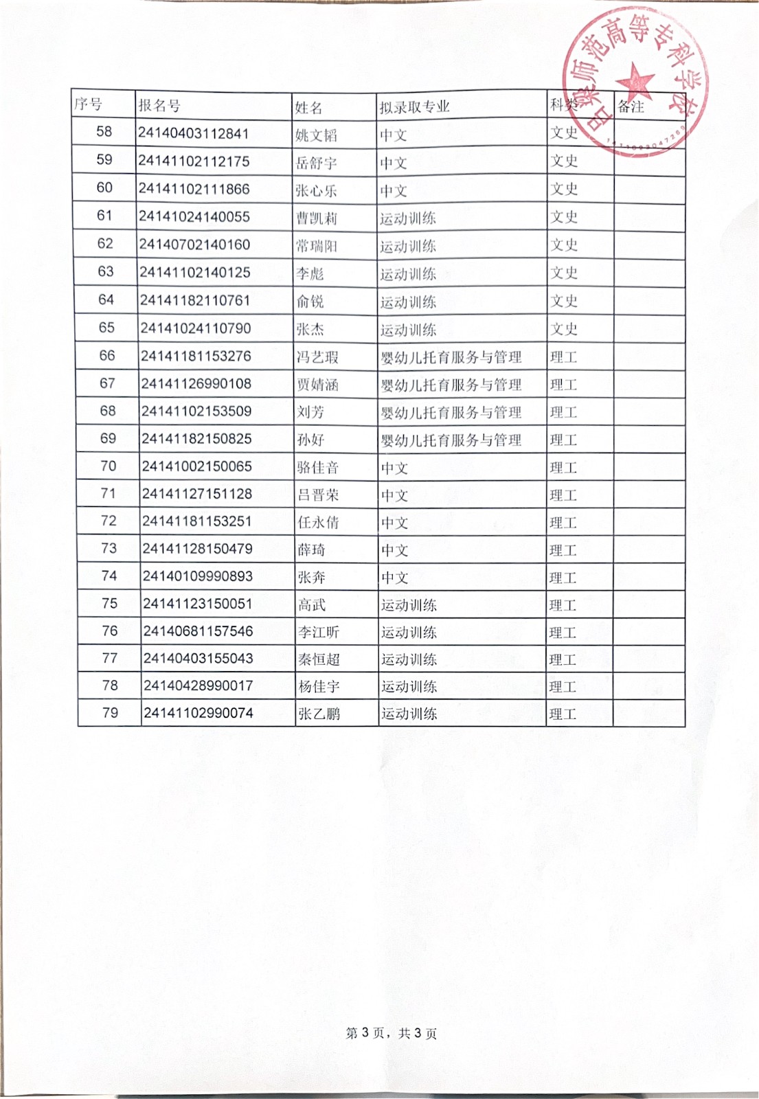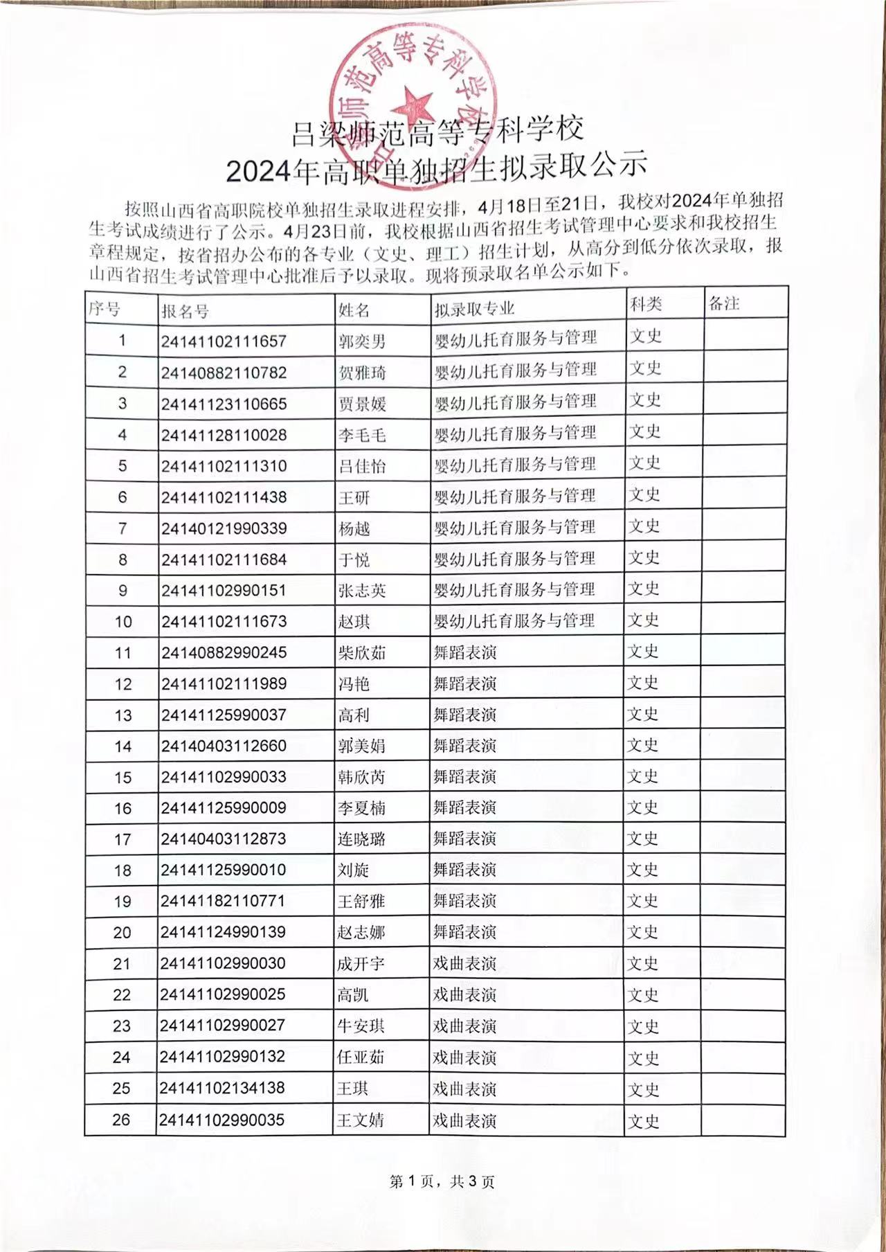 吕梁师范高等专科学校 2024年高职单独招生拟录取公示