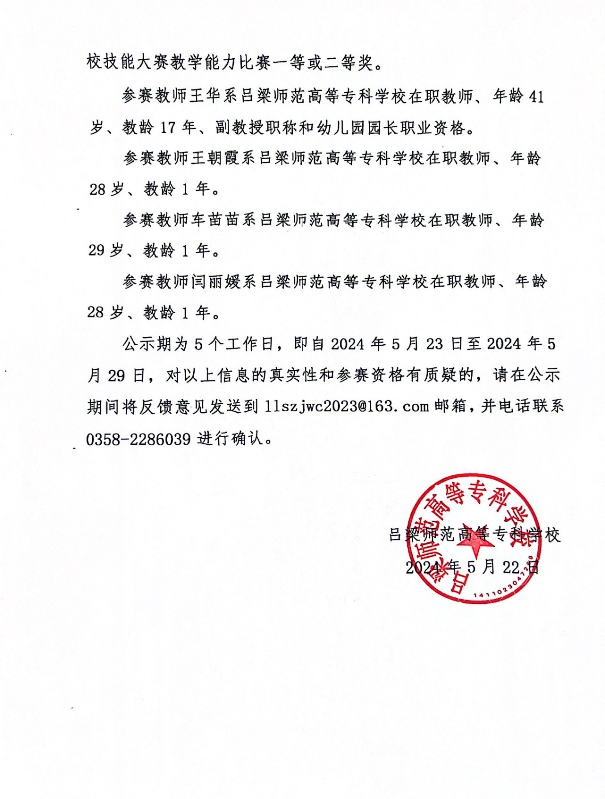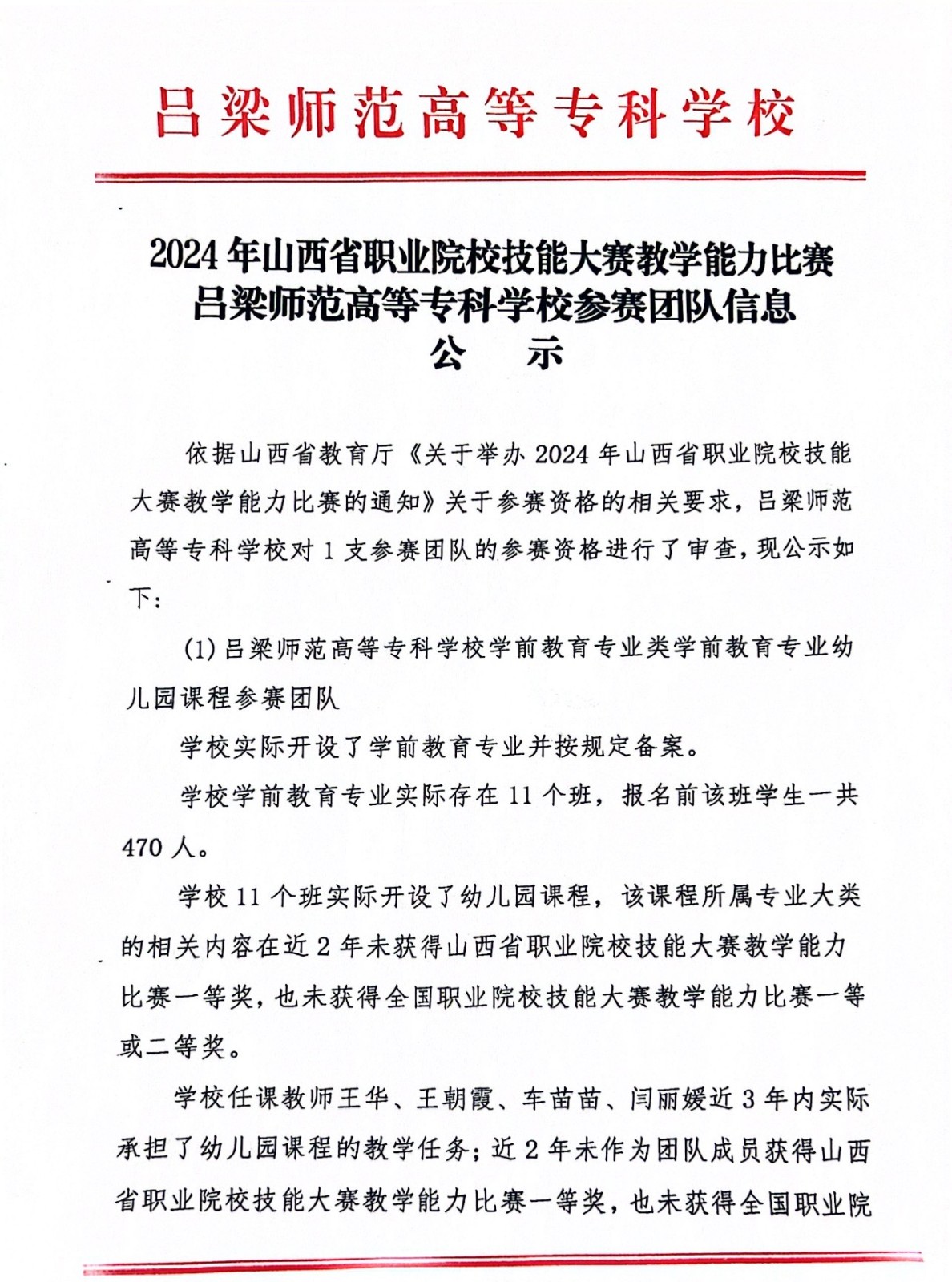 2024年山西省职业院校技能大赛教学能力比赛 吕梁师范高等专科学校参赛团队信息公示